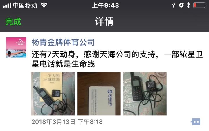 楊青將全程攜帶由天海世界提供的銥星衛星電話作為安全保障