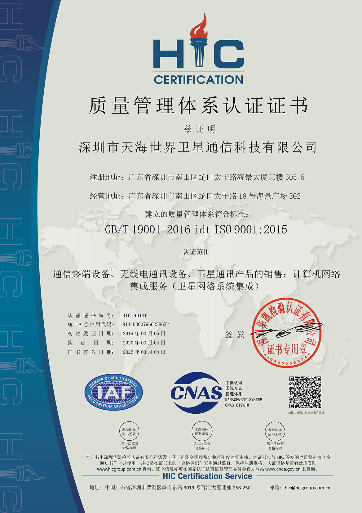 天海世界獲得《質量管理體系質量認證證書》,認證范圍為通信終端設備、無線電通設備、衛(wèi)星通訊產(chǎn)品的銷售;計算機網(wǎng)絡集成服務 (衛(wèi)星網(wǎng)絡系統(tǒng)集成)。這一證書的頒發(fā),體現(xiàn)了公司質量管理和質量保證能力符合相應標準,是對公司品質管理的認可。