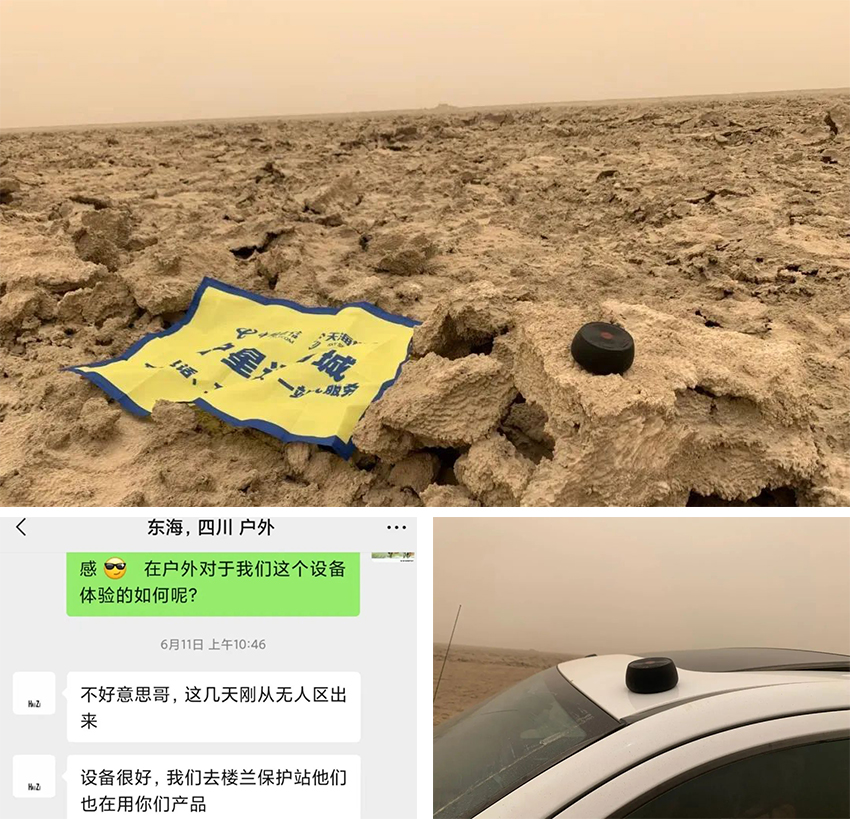 我們團隊十來個人,在進入羅布泊后就把這個小東西放到車頂,吸頂這個設計不錯,吸附力很強,大風和一路顛簸都沒有掉下來。可能無人區空曠吧,設備搜信號特別快,操作也很簡單,手機提前下個APP,按照說明接入就可以了,通話質量和普通衛星電話沒有什么差別,而且不用去查通訊錄了,手機上直接打。客服說這個衛星貓可以同時8個人接入,反正我們三五個人是沒問題。我覺得還有一點優勢,就是設備吸在車頂,人坐在車里就可以打衛星電話,要是遇上天氣不好,這就太實用了。設備也有不足之處,是僅限安卓手機可以用,暫時不支持蘋果手機。